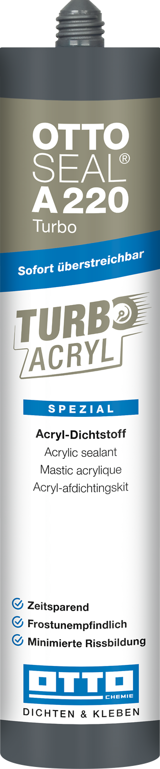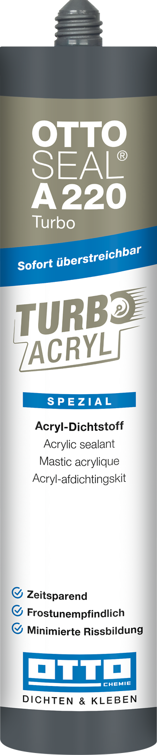 Az OTTOSEAL® A 220 speciális Turbo-akril tömítőanyag tökéletesen alkalmas az időtakarékos munkavégzéshez és a kereskedelmi forgalomban kapható diszperziós festékekkel történő azonnali átfestéshez. Magas fehérségi fokának köszönhetően tökéletes választás a belsőépítészeti fal- és mennyezeti csatlakozási fugákhoz, például a fal és az ajtókeret közötti, vagy a lábazati szegélylécek feletti tömítésekhez.